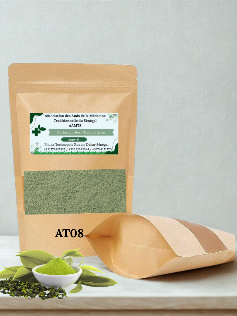 AT08 est un remède traditionnel 100 % naturel, formulé pour les personnes souffrant de perte d’appétit, faiblesse physique, ou manque de vitalité. Ce traitement en poudre, à prendre sous forme de tisane, agit en douceur pour réveiller l’envie de manger, renforcer le système digestif et redonner de l’énergie au corps.